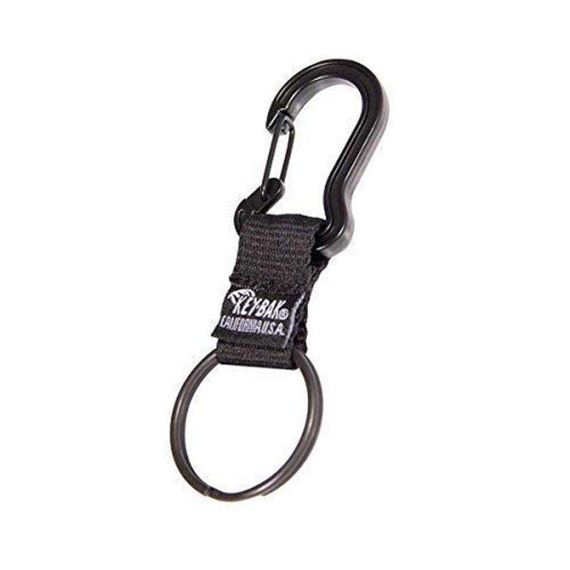 - Black aluminum carabiner with ballistic nylon strap and 1.25 inch (3.2 cm) black steel split-ring measuring 4.5 inches (11.4 cm)