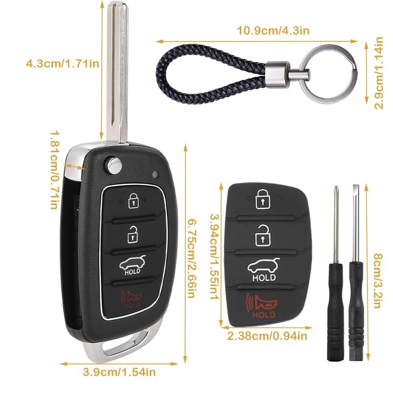 - 【High Quality Material】The flip car key fob cover hard shell is made of ABS plastic and metal, the key fob rubber pad keypad is made of soft rubber, which are durable. The key fob shell size: 6.75x3.9x1.81cm / 2.66x1.54x0.71 inches. The Insert key fob button pad size: 3.94x2.38cm / 1.55x0.94 inches.