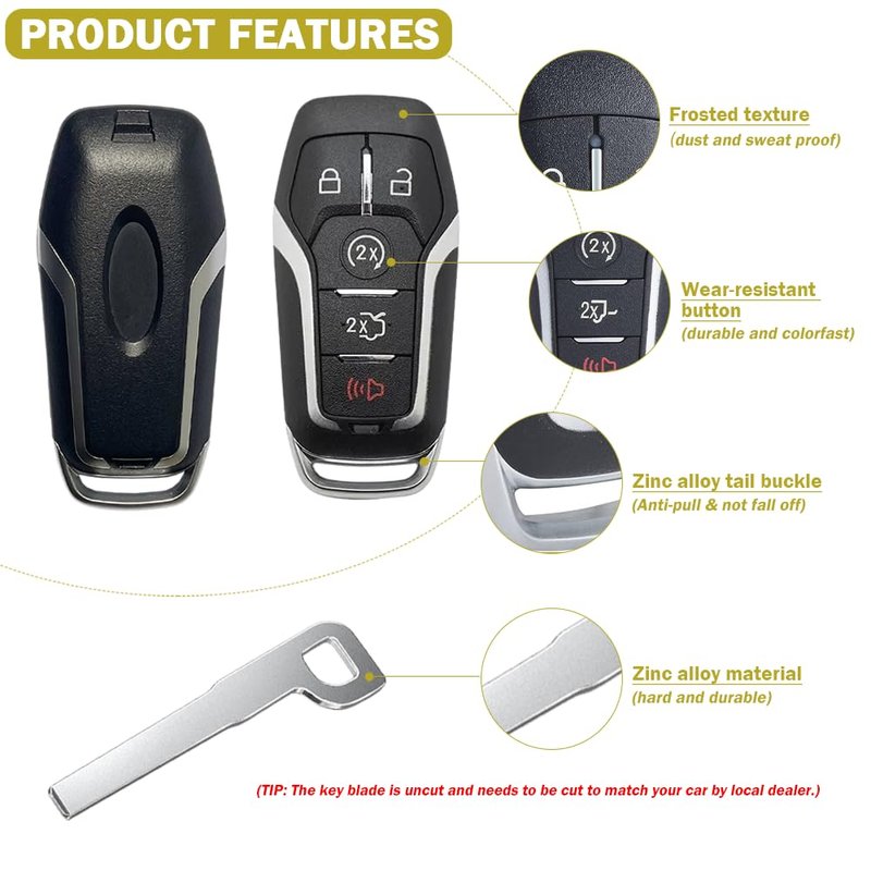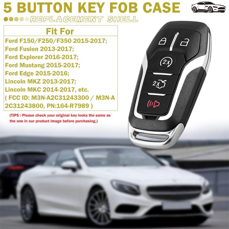 - 【Compatibility】This 5 buttons key fob replacement case shell is compatible with Ford F150 / F250 / F350 2015-2017; Ford Fusion 2013-2017; Ford Explorer 2016-2017; Ford Mustang 2015-2017; Ford Edge 2015-2016; Lincoln MKZ 2013-2017; Lincoln MKC 2014-2017, etc. ( FCC ID: M3N-A2C31243300 / M3N-A2C31243800, PN:164-R7989 )