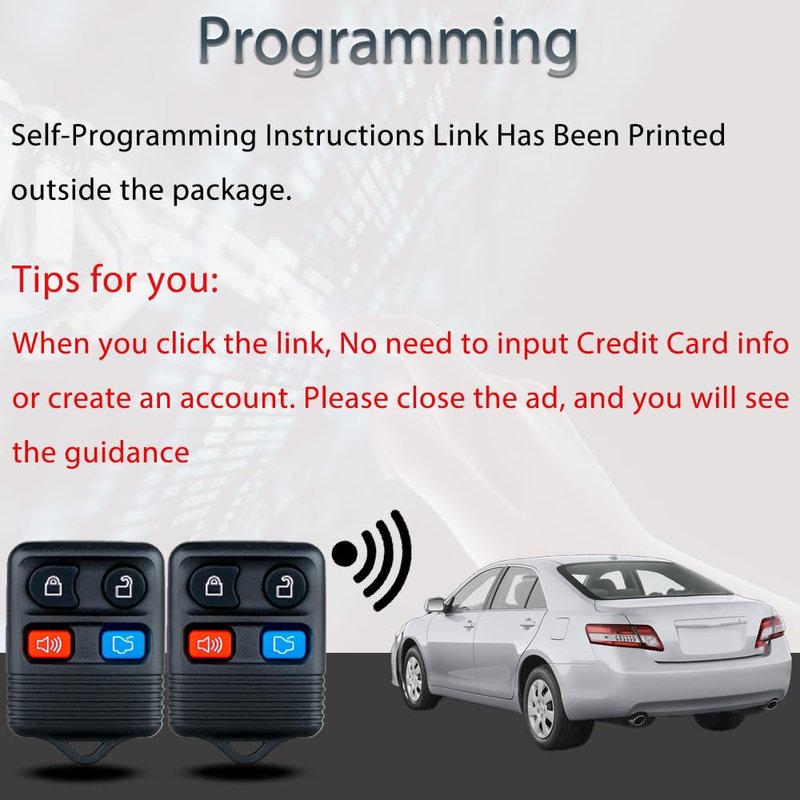 - 【Programming Methord】Some remotes can self-programmed. But up to 2011, the others are not onboard programmable, this remote fob key must be programmed by a qualified locksmith or dealership.【Notice】Do not need to provide any credit information, just close the ad. when clicking on the link of instruction website.