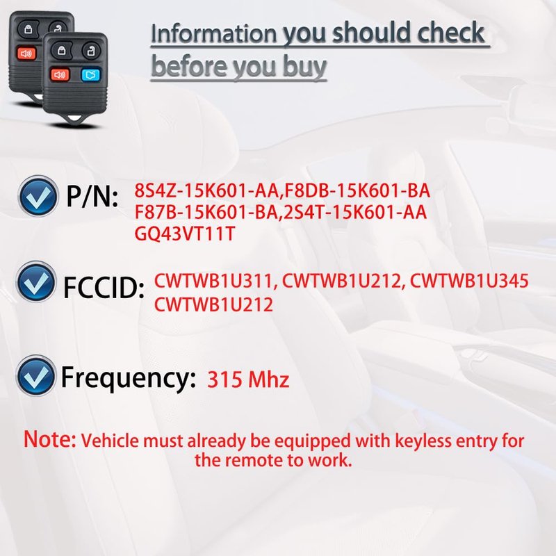 - 【Replacement 】For Remote fob P/N:GQ43VT11T, 8S4Z-15K601-AA, F8DB-15K601-BA, F87B-15K601-BA, 2S4T-15K601-AA ; FCC ID:CWTWB1U311, CWTWB1U212, CWTWB1U345,CWTWB1U212;