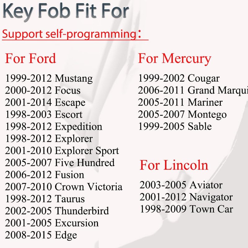 Ford 1999 - 2012 Mustang 2000 - 2012 Focus 2001 - 2014 Escape 1998 - 2003 Escort 1998 - 2012 Expedition 1998 - 2012 Explorer 2001 - 2010 Explorer Sport 2005 - 2007 Five Hundred 2006 - 2012 Fusion 2007 - 2010 Crown Victoria 1998 - 2012 Taurus 2002 - 2005 Thunderbird 2001-2005 Excursion 2008-2015 Edge Lincoln 2003 - 2005 Aviator 2001 - 2012 Navigator 1998 - 2009 Town Car Mercury 1999 - 2002 Cougar 2006 - 2011 Grand Marquis 2005 - 2011 Mariner 2005 - 2007 Montego 1999 - 2005 Sable Part # GQ43VT11T, 8S4Z-15K601-AA, F8DB-15K601-BA, F87B-15K601-BA, 2S4T-15K601-AA & More FCC ID: CWTWB1U311, CWTWB1U212, CWTWB1U345,CWTWB1U212