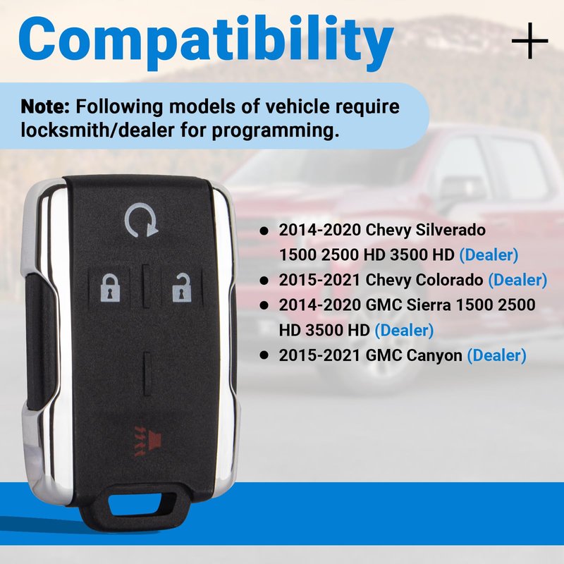 - Applicable Vehicle Type: This key is compatible with 2014-2020 Chevy Silverado | 2014-2020 GMC Sierra 1500 2500 3500 2500HD 3500HD|2015-2021 GMC Canyon| 2015-2021 Chevrolet Colorado Please check our product description for more details.