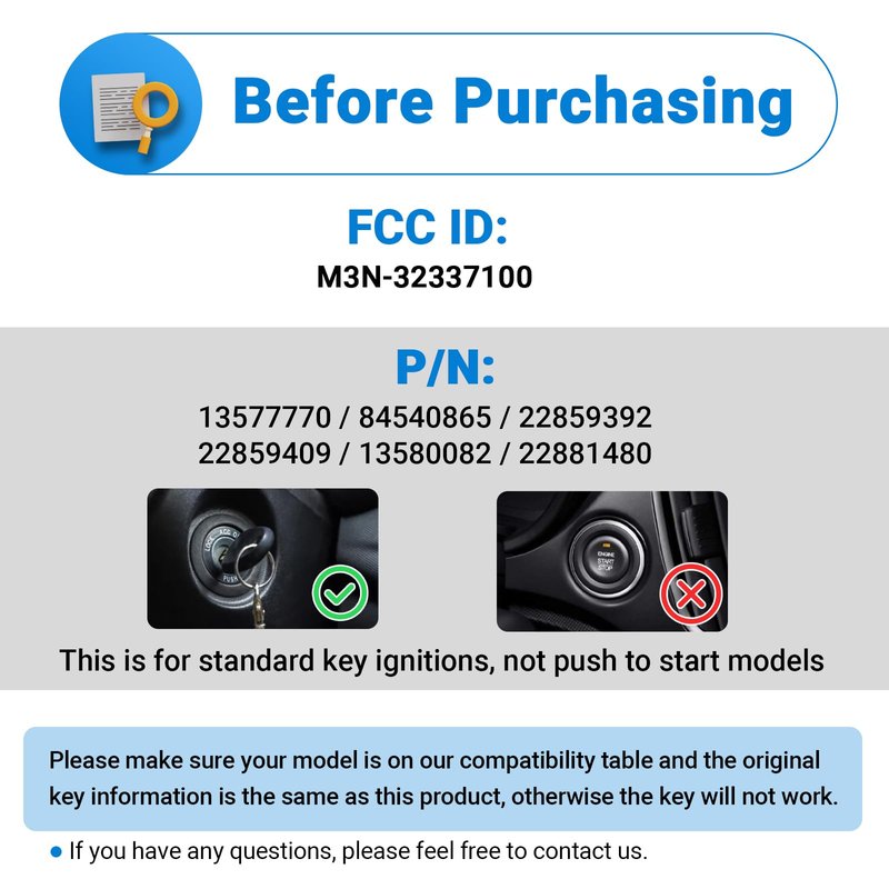 - Replacement: This key is compatible with FCC ID: M3N32337100 / M3N-32337100; Part Numbers: 13577770, 84540865, 22859392, 22859409, 13580082, 22881480 Please make sure that the information on your original key matches the above information before purchasing.