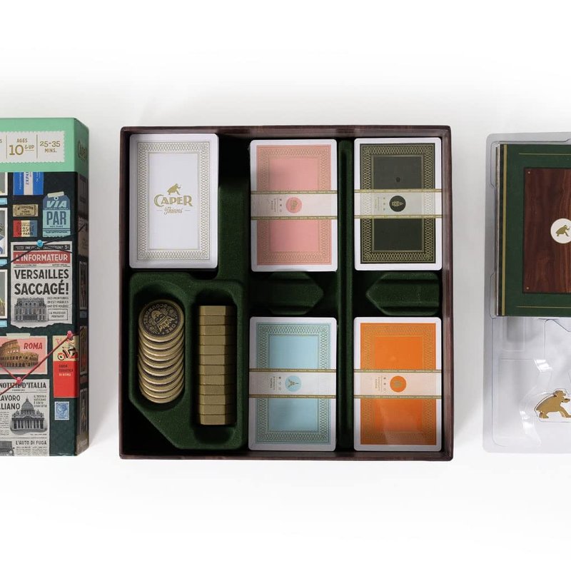 Become the greatest Mastermind to ever pull off a European heist in this two-player card drafting board game. Pull off daring capers across four international cities: Paris, Barcelona, London, and Rome, each with its own set of sneaky characters, goofy gear, and iconic locations. Caper: Europe takes place over six rounds across three locations where you’ll play thief and gear cards to acquire stolen goods, outwit your opponent, and take control of the museums, cafes, monuments, streets, and shops of the continent. Cards change hands each turn, so you never know what options you’ll have. It’s a quick and simple strategic card game for two players only. Go head-to-head with your spouse, kid, friend, parent, or grandparent. The perfect game for couples – a great gift for your significant other or anyone who loves gaming, scheming, or European trave. With a clear and tight set of rules, this light game is easy to pick up. You and a fellow mastermind will be playing in under 10 minutes and each game is fast and furious with a 30-minute playtime. Endlessly replayable with four separate game modules that send you scrambling across a different city every time. New characters, locations, gear, and unique rules will leave you wanting to rematch again and again and again, trying to outwit your opponent. Beautiful artwork and high-quality custom wooden components will transport you to your favorite heist film, with ‘50s inspired art that evokes the posters of classic criminal capers. And every Keymaster game features excellent organization and custom trays and inserts, so Caper Europe is effortless to set up, put away, and set up again for more fun. Awarded the Dice Tower Seal of Excellence, and featured on countless lists of the best two-player games, top tens, and games of the year.