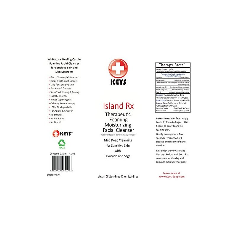 Keys Island Rx Therapeutic Foaming Moisturizing Cleanser was developed to be used on sensitive skin like the face and neck. The foaming applicator automatically dilutes the Island Rx formulation so that it can be used directly on wet skin. It is also great for bathing small children and babies. Keys Island Rx is based on a 300-year-old Castile soap recipe with holistic and naturopathic influences in the form of healing essential oils, a Micelle that resembles the antioxidant properties of natural glacier water, and the addition of softening oils like avocado and jojoba. Keys customers have reported the reversal of common skin disorders like eczema, dermatitis, psoriasis, acne, and skin allergies after just a few uses. Vegan, No Animal Testing Gluten-Free, Soy-Free, No Preservatives, and Chemical-Free Made in the USA.