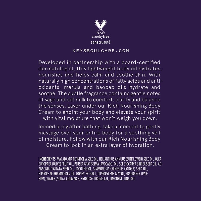 Keys Soulcare Sacred Body Oil with Marula Oil, Lightweight, Non-Greasy, Hydrates, Calms & Nourishes Skin with Manuka Honey, Cruelty-Free, 1.69 Fl Oz