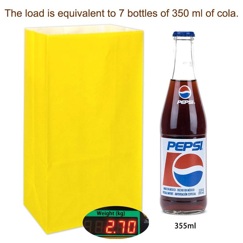 - Size: Small paper bags yellow measure about 3.1 X 5.1 X 9.4 inches.We provide three sizes of the bag for customers to choose,and customer can see how many bottles of cola can put in every size(in the second picture).It is great sincere that we not want my customers to go hungry because of the size of bags and hope you can spend a happy day with our products which decorated with your favorite color.