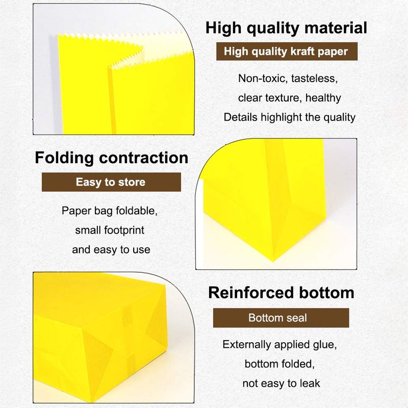 Material: These small paper bags yellow are made from recycled material and durable kraft paper material. Widely used for girl/ boy/ adult.