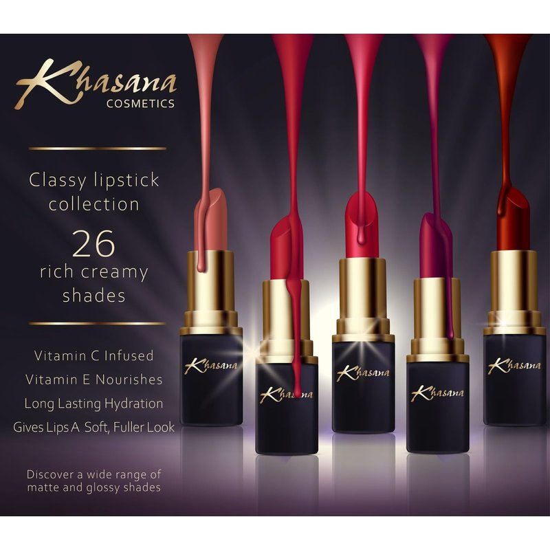 - TRENDY SHADES & ALL LIPS TYPES: Paint your smile with our vibrant, bright, and on-trend 24 different colors. Khasana Classy lipsticks, with its elegant and classic design, are resistant, hydrating, creamy, moisturizing, gives a natural effect of full lips.