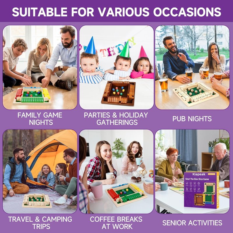- [ Perfect for Family Gatherings & Parties ] 🎲The Kiapeak Shut The Box Dice Game brings everyone together! Ideal for 1-4 players, this classic wooden game is perfect for family game nights, lively parties, or casual fun at the pub. Experience laughter and competition as you play!