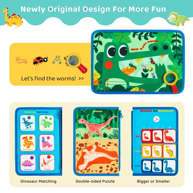 - BRAND-NEW DESIGN-Kickduck Busy Board has been upgraded with our Toddler Busy Board that combines dinosaur elements with cognitive skills such as learning numbers, comparing sizes, color matching, puzzles, finding bugs, dressing and more. The dinosaur theme is more fun and engaging than other busy boards, allowing toddlers to develop fine motor skills while staying entertained