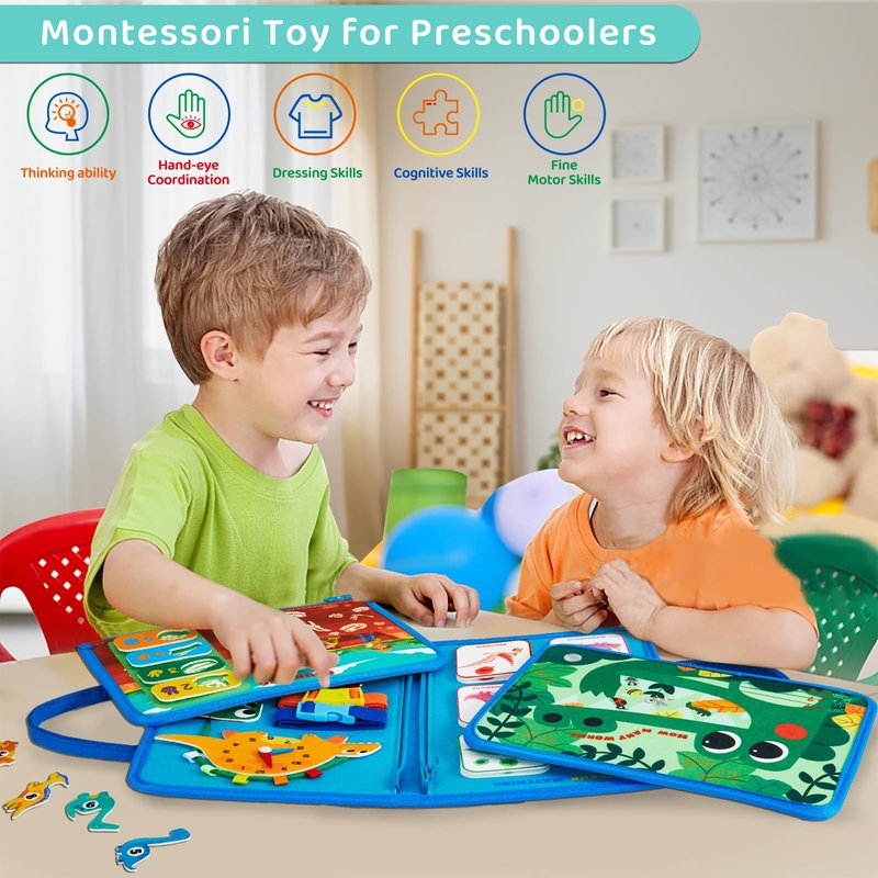 - 8-IN-1 MONTESSORI TOY-Montessori toys help learning through play. Features Montessori toddler activities that include learning games such as zippers, buttons, belt buckles, puzzles, letters, clocks and touch. Fun preschool learning activities which stimulate Montessori-inspired practical life skills, fine motor skills, problem solving skills, logical thinking and hand-eye coordination
