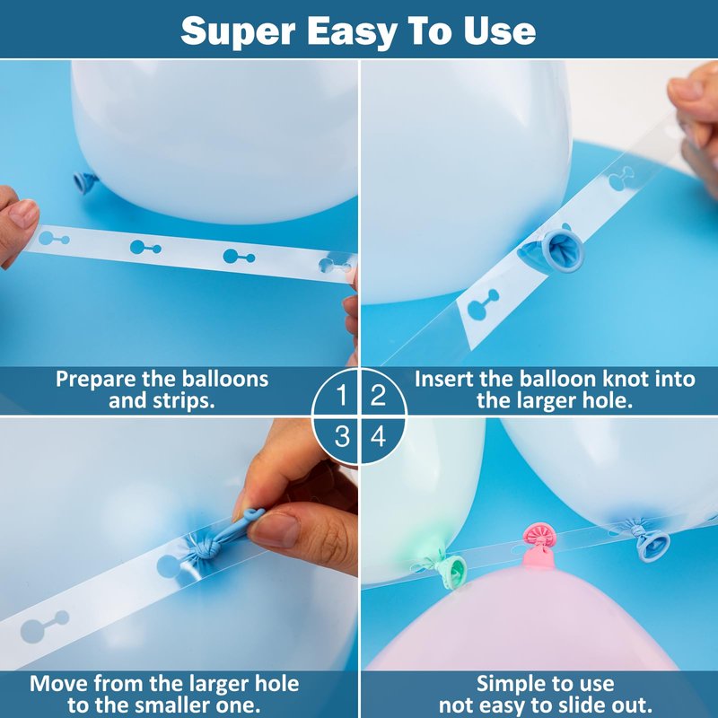 Compared to a single-hole balloon strip, the two-hole design makes it easier to fit into a balloon, and never worry the balloons will fall out after it is inserted into the small hole.