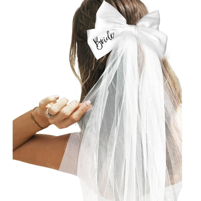 KICOSY Bride Bow Veil for Bachelorette Party White Bridal Bow Bachelorette Veil for Bride Bridal Veils for Women Wedding White Hair Bow White Lace Ribbon Bow Veil