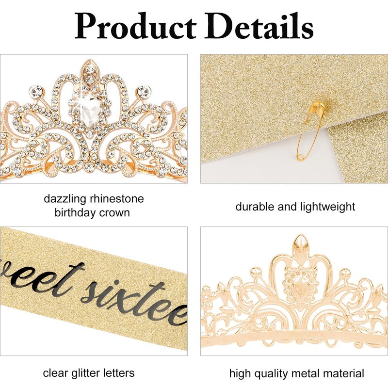 - 【Perfect Sweet 16 Birthday Set】 "Sweet sixteen" birthday sash + luxury rhinestone jewelry crown set, this perfect kit is very suitable for 16 year old girls. You can choose the right color according to the birthday party theme, and any of the crowns will match perfectly with your 16th birthday party. In addition to the traditional 16th birthday decorations such as balloons and banners, add a birthday crown for the girl to take beautiful photos and leave valuable memories for the future.