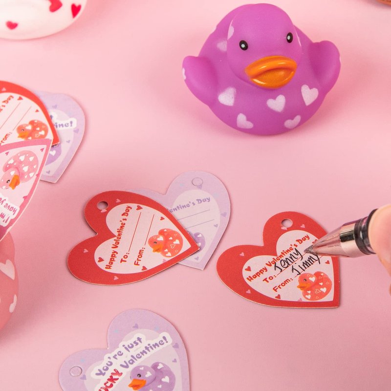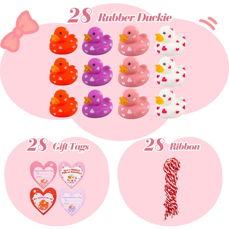 - ❤️Great Value – 28 Packs Valentines Day Gift Cards with Cute Mini Rubber Duck Bath Toys in Red, White, Purple, Pink with Heart Shape Patterns.