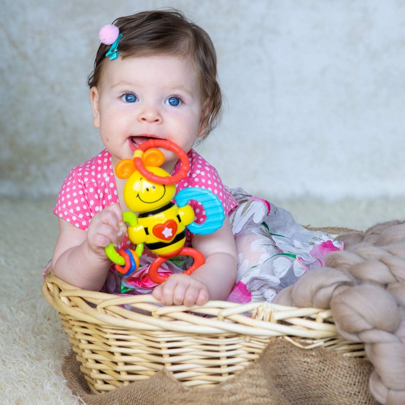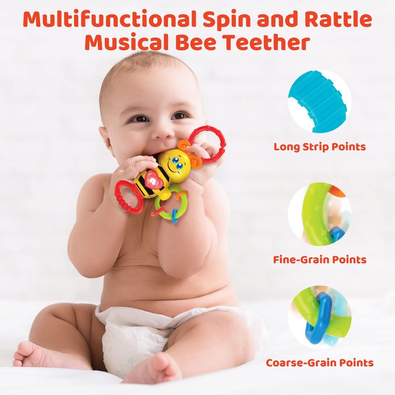 - A VARIETY OF SENSORY EXPERIENCES: Turn the gripper handle to produce a clicking sound, freely spin the rings on the bee’s wing, or feel the gentle texture of the teething ring.