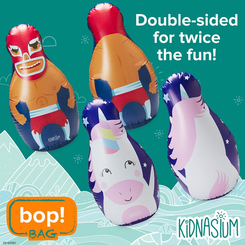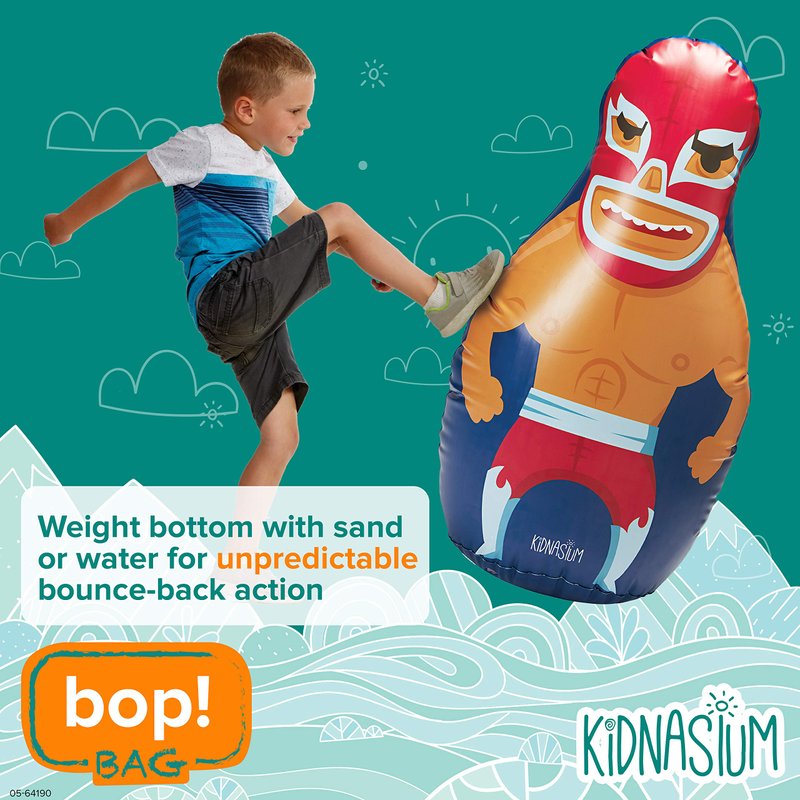 - KIDS BALANCE BALL BOP BAG: Kidnasium Bop Bags are kid-sized inflatable balance ball bags that are fun to tackle, bop and pop - just add water or sand to the base after inflating to enable the bag to snap back and stand upright (sand not included)
