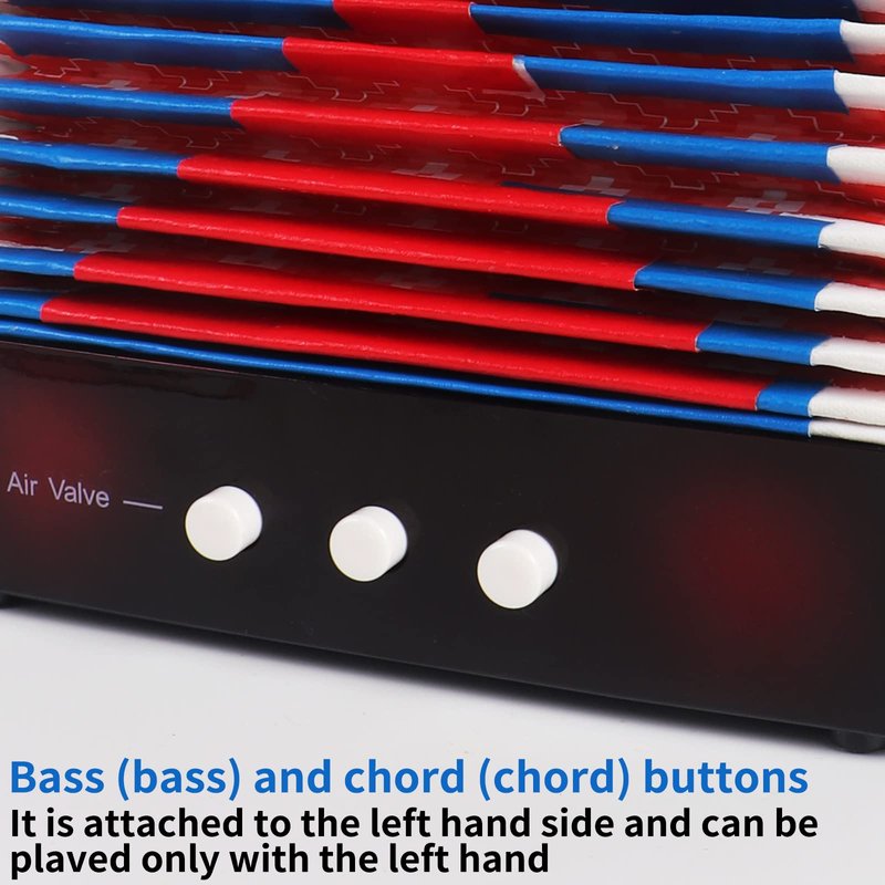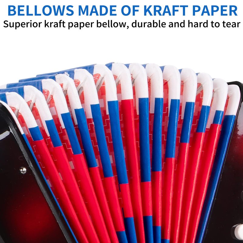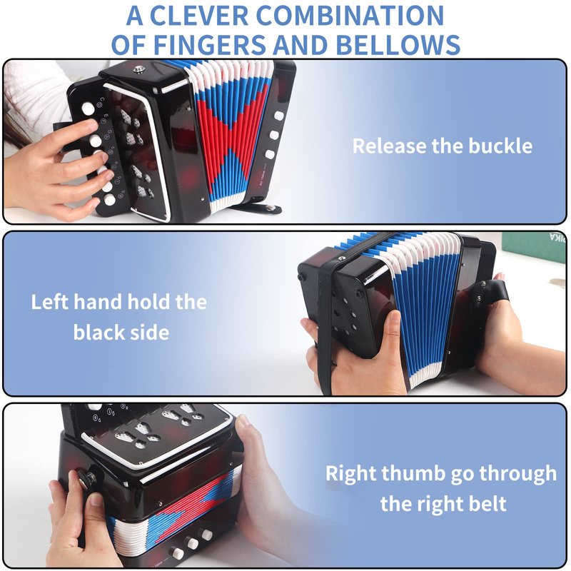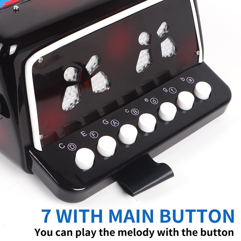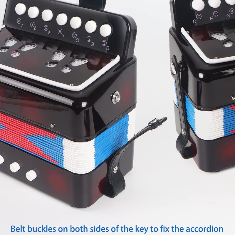 - Perfect detailed design: High-quality bellows, sturdy and durable, made of safe materials. 7 buttons can meet the needs of general music. Belt buckle, untie when you want to use it, and close it when not in use. The soundhole, when you play this accordion, a beautiful concert comes from the soundhole.