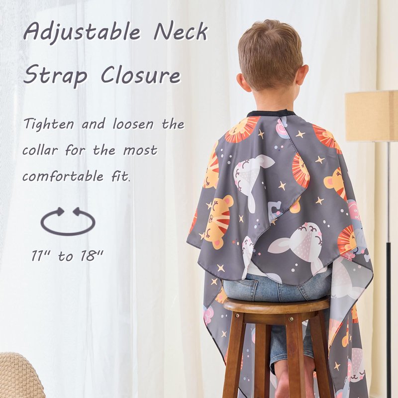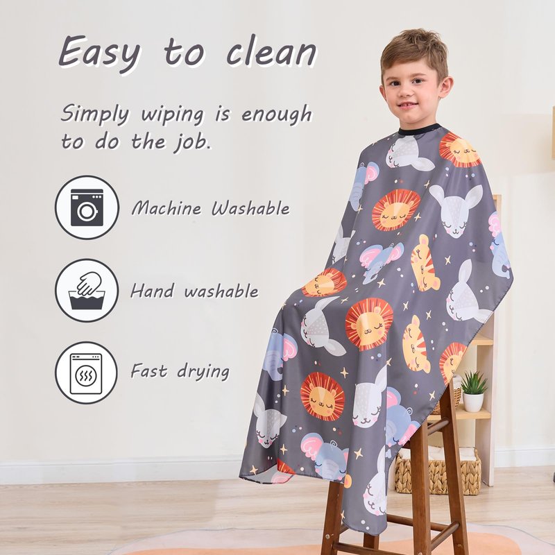 - 【Cute Animal Pattern】Monotonous capes usually too boring for kids, therefore hard to attract them. The tension of haircut will have nowhere to transfer and release. Obviously, such an experience cannot be called pleasant. This time, we designed this cape for kids' own interest. Our kids hair cutting cape is filled up with animal pattern, which is lovely and can attract kids’ attention, leads them interacting with cute animal while taking haircut.