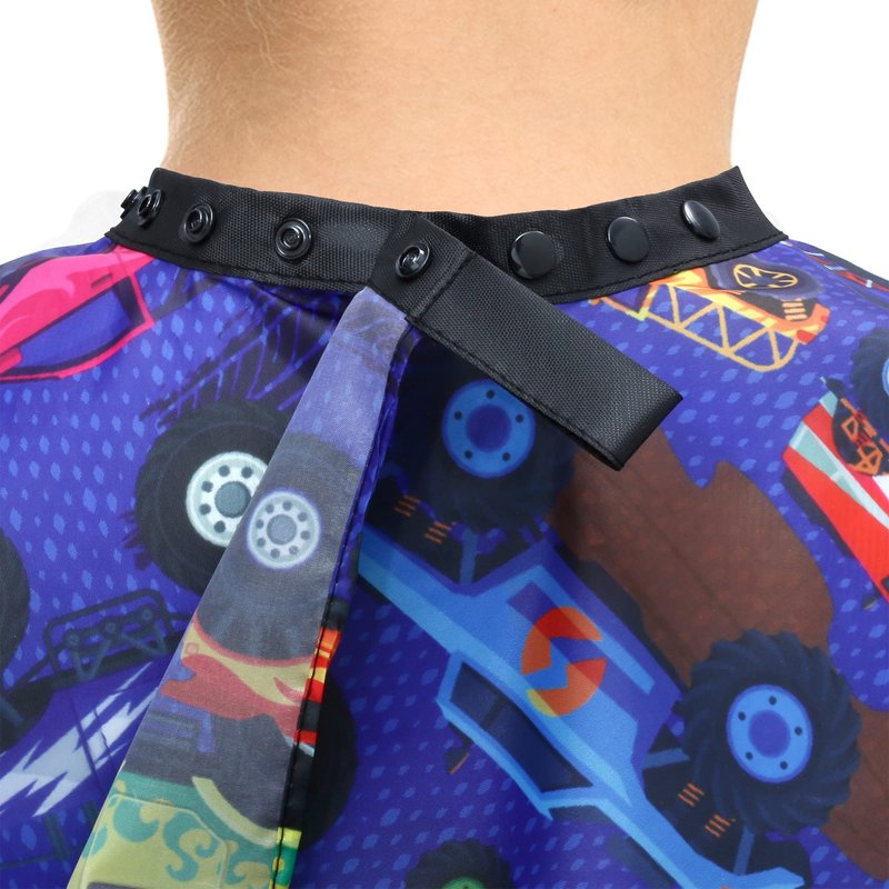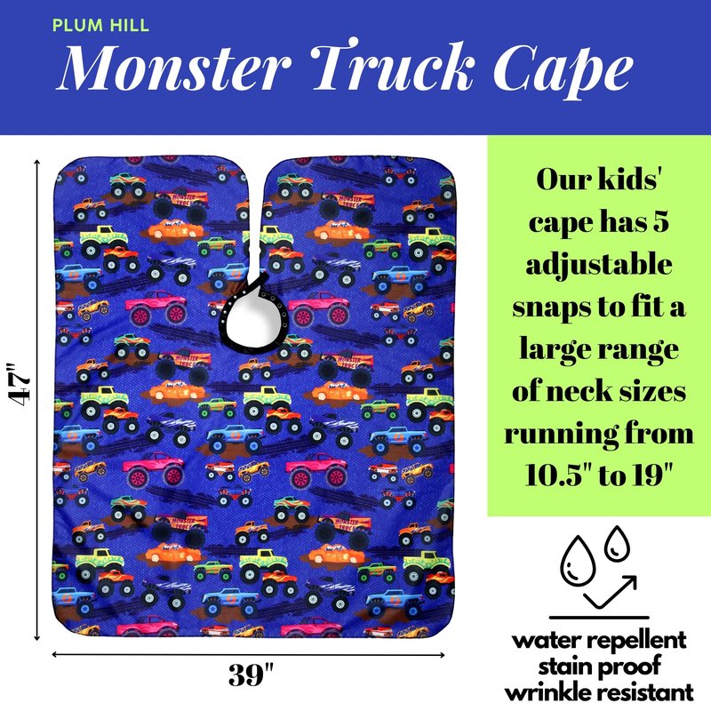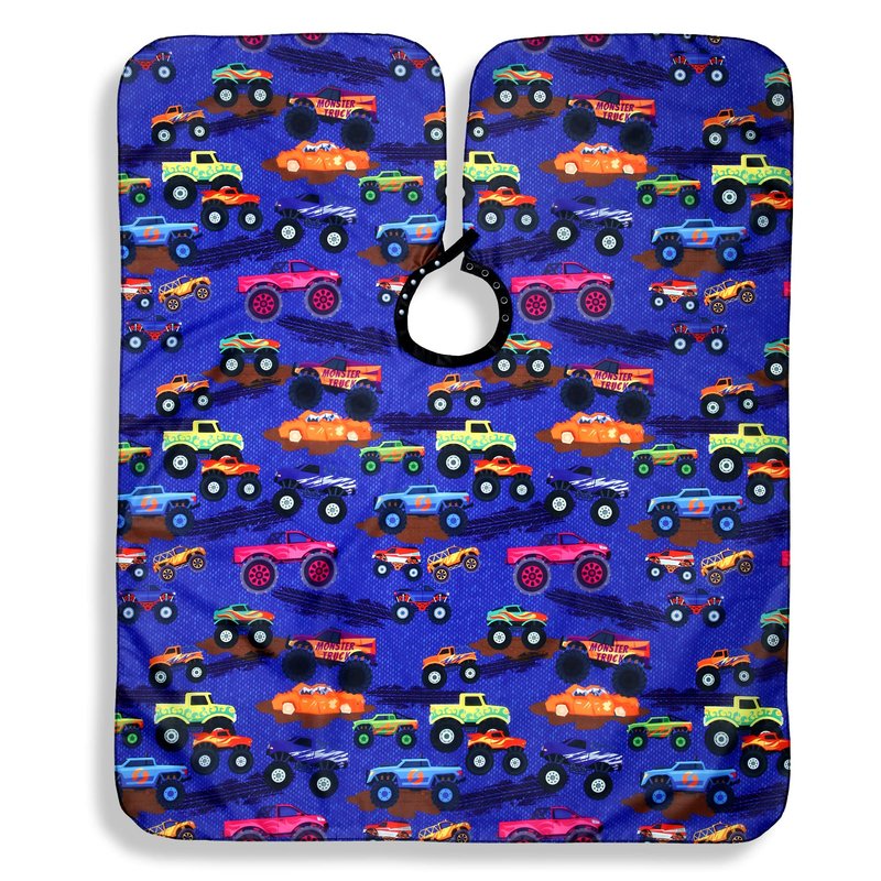 - MONSTER TRUCK DESIGN - Get your child excited for haircuts with our kids hair cutting cape! Whether they're getting their hair styled at a salon or at home, this eye-catching cape is sure to spark their imagination and turn haircuts into a fun and memorable experience.