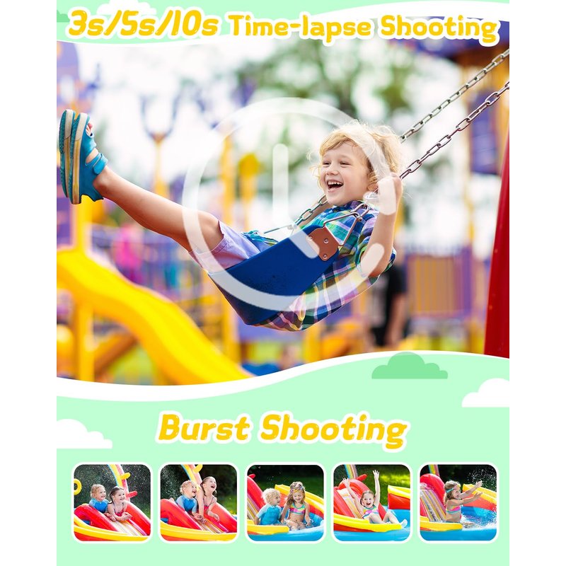 - SNAP LIKE A REAL PRO: Capture stunning time-lapse shots in 3s, 5s, and 10s intervals, as well as burst shooting for fast-paced action. Perfect for creating captivating visuals.Let's see what your kids capable of with this kids camera
