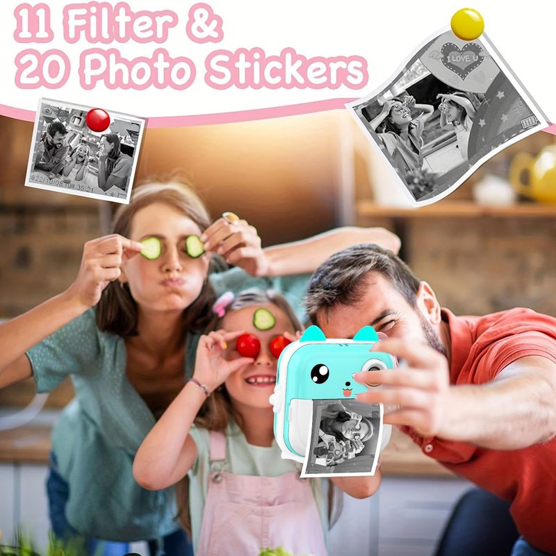 - This kids camera is both a digital camera and an instant print camera for kids which allows kids to take color images, record 1080p HD videos and print black&white photos. Moreover, this instant print camera also comes with 3 cutes cartoon stickers, 5 colored pens for DIY to stimulate children’s imagination and creativity. Fun Birthday/Christmas/Daily gift for kids age 3-14.