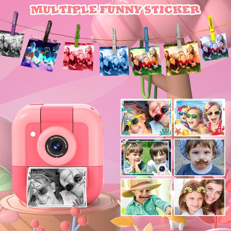 - 【Funny Instant Print Camera 】This instant print camera for kids Simply press the shutter to record everyday moments and instantly print them as black-and-white paper photos, or use the 32 SD card to record colour HD video.But it also boasts entertaining features such as continuous shooting, time-lapse, and filters.Children can take interesting pictures and doodle pictures to stimulate imagination.