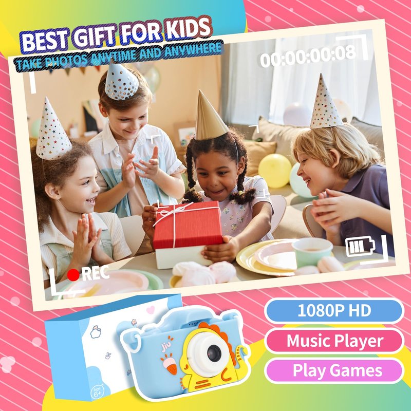 - 【Children's cameras can record multiple scenes】kids camera Equipped with auto Focus, 96.0 Mega pixels and 1080P Video. kids camera for girls Greatly improved the definition of photos . Catch the wonderful joy moment for boys or girls. kids digital camera With Big head sticker shooting, children can take photos with frames, appareil photo enfant , leave some hilarious photos with family or friends
