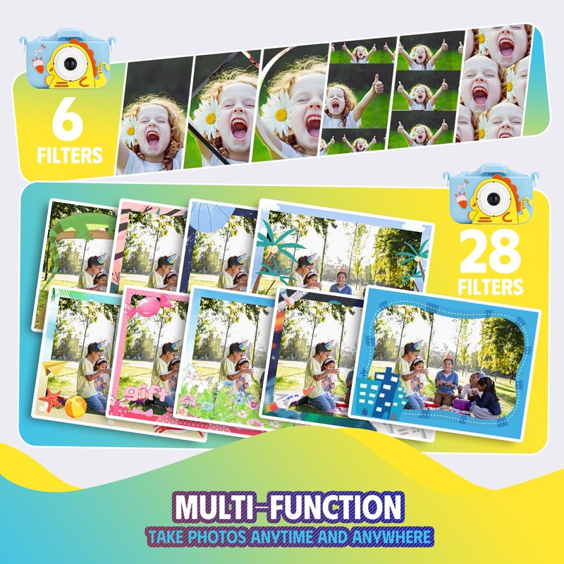 - 【Built-in USB Rechargeable Powerful Battery and 64G SD card】 With the built-in large capacity lithium battery can continuously taking photos for 2-3 hours after full charged! Kids digital camera with large 64GB SD card which can store 8000 pictures allows kids to shoot anywhere anytime, without being worried about which to delete in case of lack of memory. They can also decorate their Own Frame or favorite scene while taking photos (28 funny frames and 6 filters )