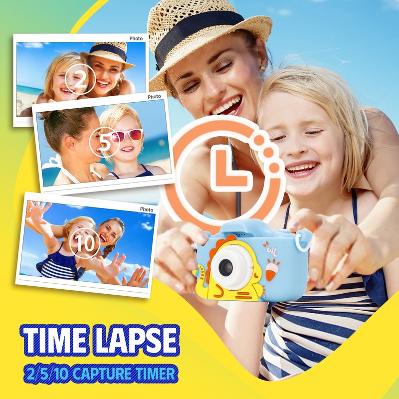 - 【Mini Kids Camera with Big Fun】The Kids selfie camera comes with Multi-Functions, it is equipped with functions such as games, selfie photo capture, real-time video recording, time lapse capture, video, music player, date setting. Download the photos and videos to a computer using the USB cable and share them with family and friends. Kids can better record their happy childhood, it will be a wonderful and precious memory when they grow up.