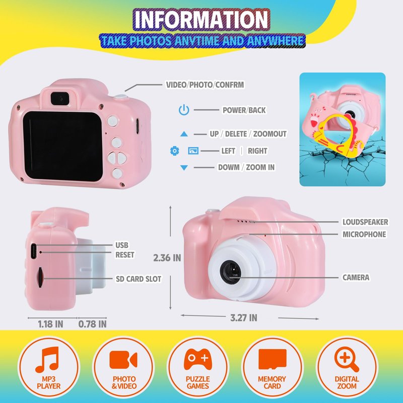 - 【 Multi functional 】 Upgrade to new children's cameras and portable camcorders. It has more features, including photo taking, video recording, playback, gaming, and date settings. Comes with a variety of puzzle games, including five motion control games, to bring more fun to children. In addition, there are 28 scene options for photos. Use the included card reader to download photos and videos to your computer and share them with family and friends