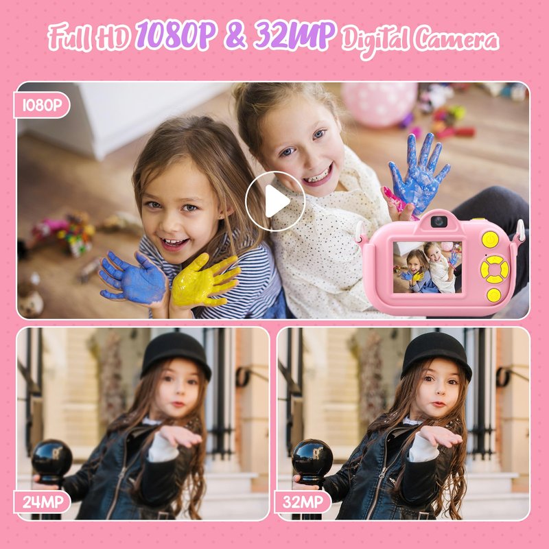 - DUAL CAMERAS & EYE-PROTECTIVE IPS SCREEN: This multifunctional kids cameras come with 32 MP front and rear dual lenses and support time lapse. Kids can not only take selfies easily with various fun photo frames, but also record the beautiful moments in their lives. The toddler camera features an upgraded 2.0-inch IPS screen for better colour reproduction, which reduces the effects of blue light radiation on children's eyes and prevents fatigue from prolonged use