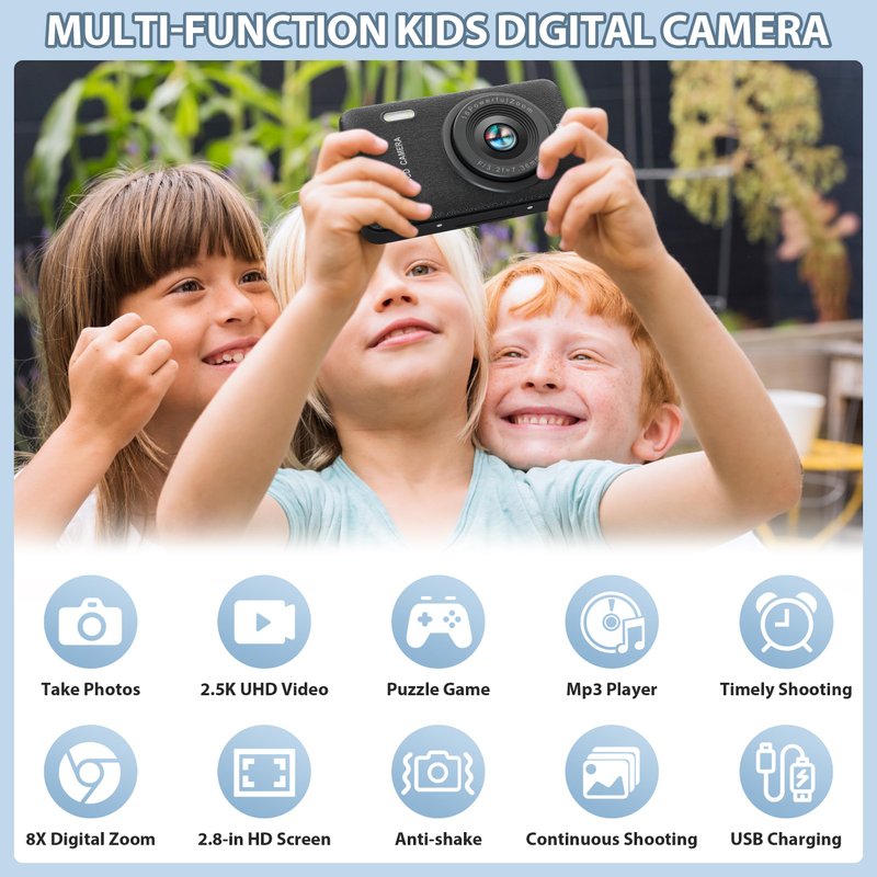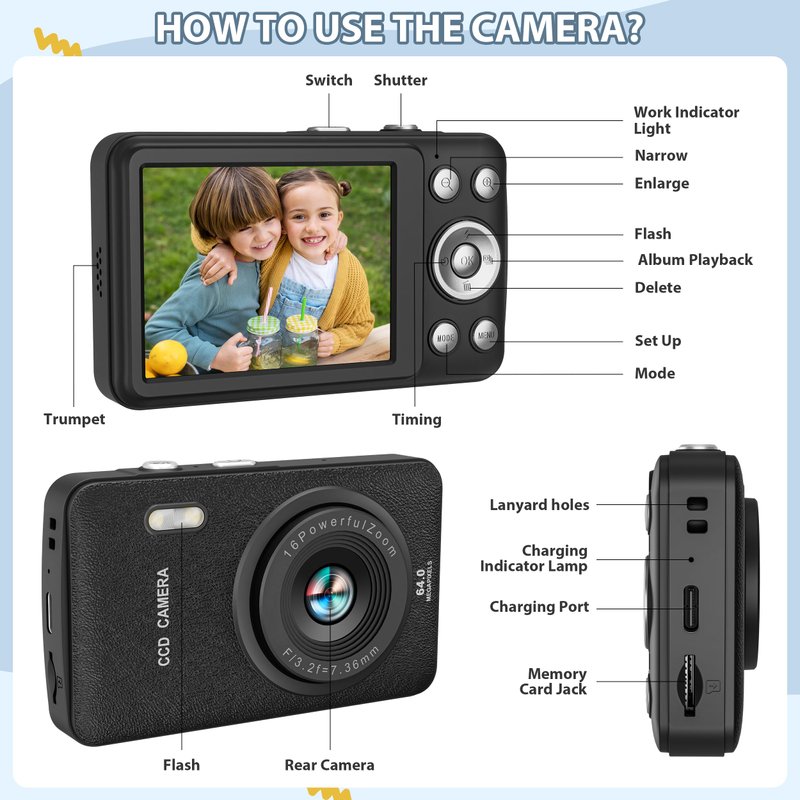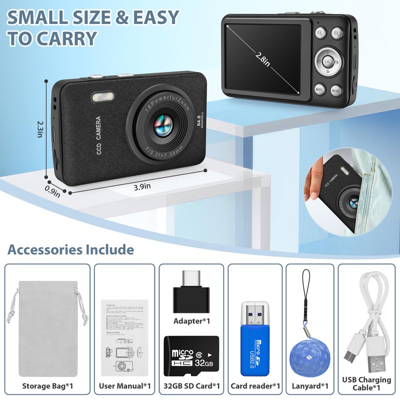 - Kids Digital Cameras: It comes with:1x Kids Digital Camera, 1x USB Charging Cable, 1x 32GB SD Card, 1x Card Reader, 1x TYPE-C Adapter, 1x Hanging Lanyard, 1x User Manual. In addition, the camera is equipped with a 2.8-inch screen, 100w pixels and 16x digital zoom, which better helps kids' photographer's dream!