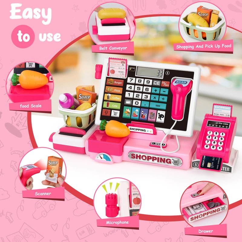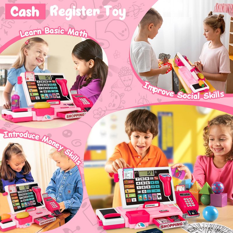 - [Cash register toy for kids] The cash register toy comes with a real calculator, helping kids to learn basic math, count money skills and develop communication skills! kids can pretend to play grocery store games with friends or for fun family time.It is a must-have toy for toddlers 4-8 as a eductional gift.