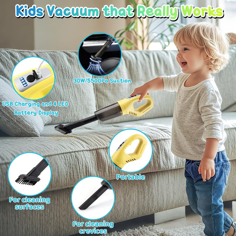 - Kids Vacuum that Really Works---Comes with a toy vacuum for toddlers that is rechargeable, cordless, portable, and with 5500 Pa real suction power, can really work at picking up debris. Realistic action and sound gives kids a real use experience. The kids vacuum also has a battery level display, making it more convenient to use.