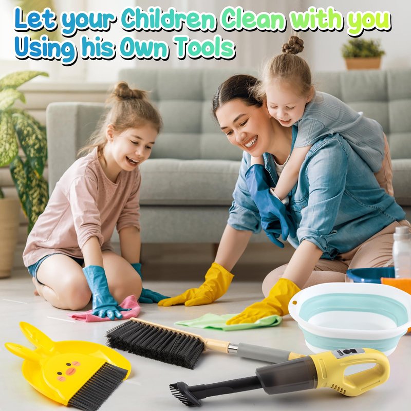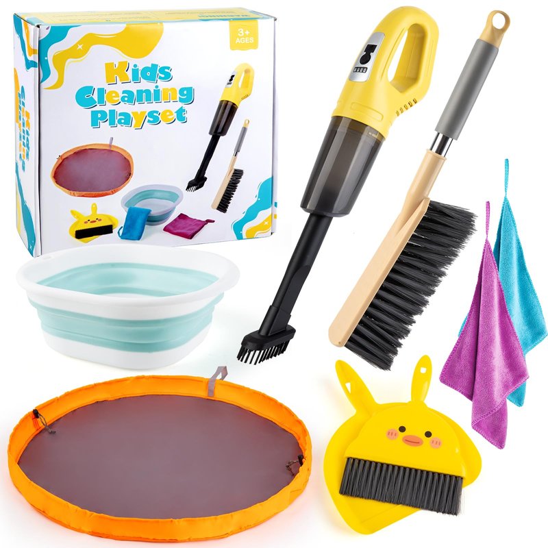 - Realistic Kids Cleaning Toy Set--The toy home cleaning set includes a mini broom & dustpan, a hand brush, a foldable basin, a toy quick storage bag, and even a kids handheld vacuum cleaner to fulfill every task in family life. All of the toddler cleaning toys included are functional and can be used for both pretend play and real home cleaning.