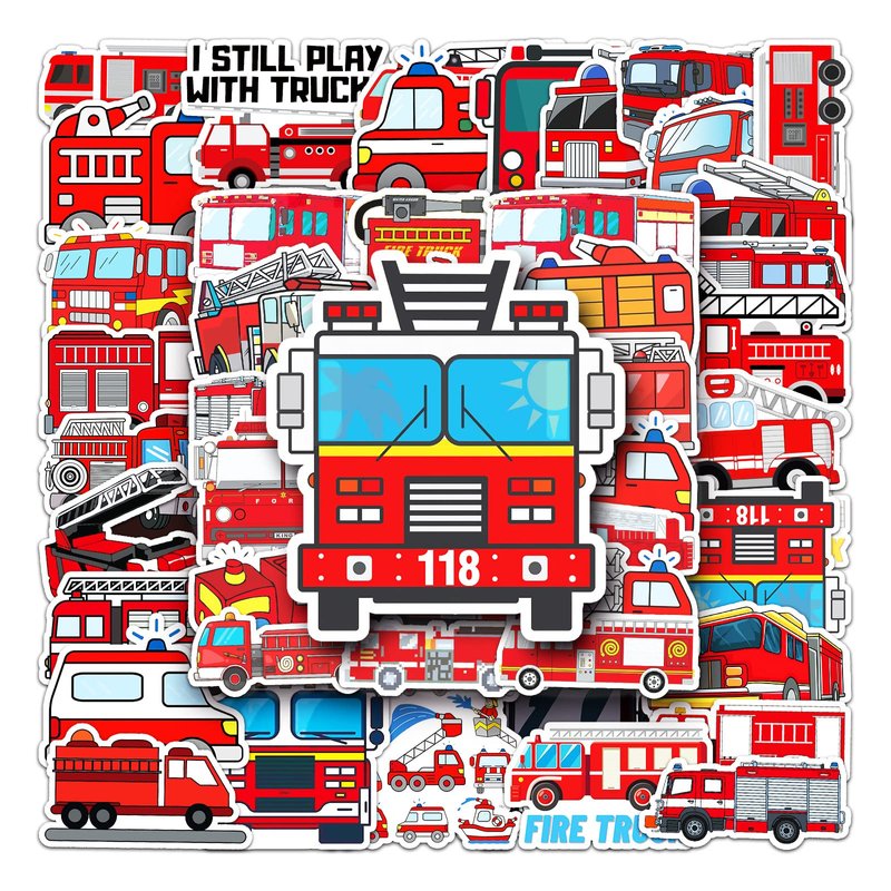 Kids Fire Truck Stickers,50Pcs Cute Cartoon Fire Fighting Engine Vehicles Vinyl Waterproof Decals,Party Decor Water Bottle Laptop Refrigerator Skateboard Sticker