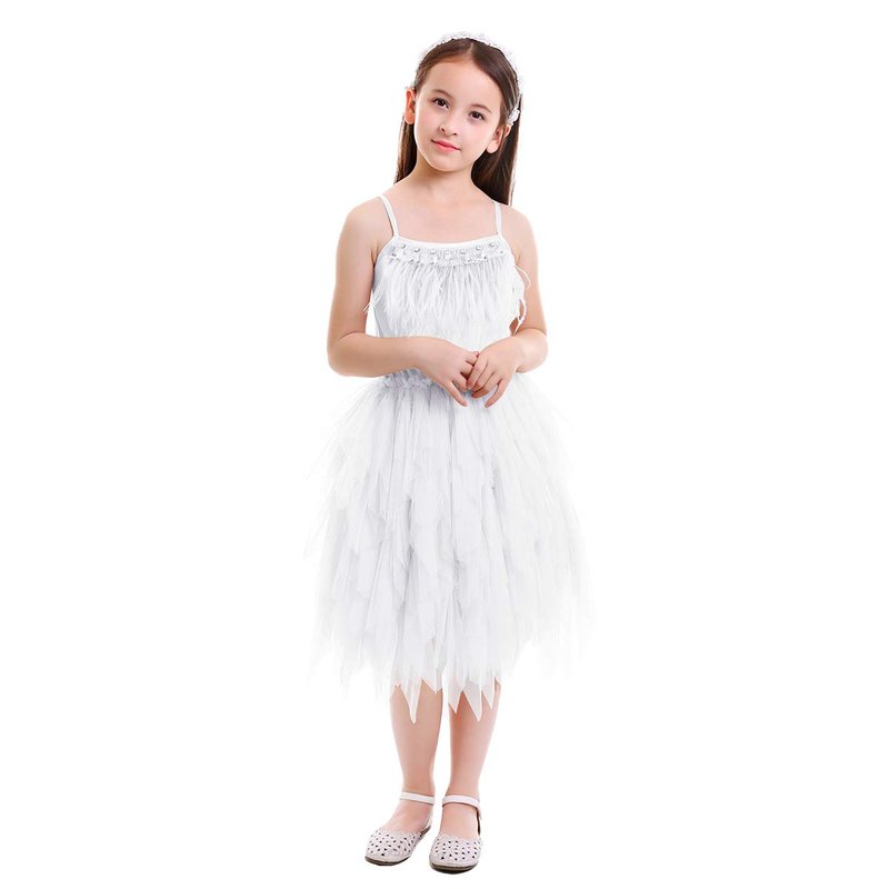 Kids Girls Spaghetti Strap Lace Feather Fringes Tutu Tulle Swan Princess Dress Ruffles Backless Ballet Leotard Dance Skirted Pageant Party Wedding Formal Birthday Cake Short Tiered Gown White 12-18M