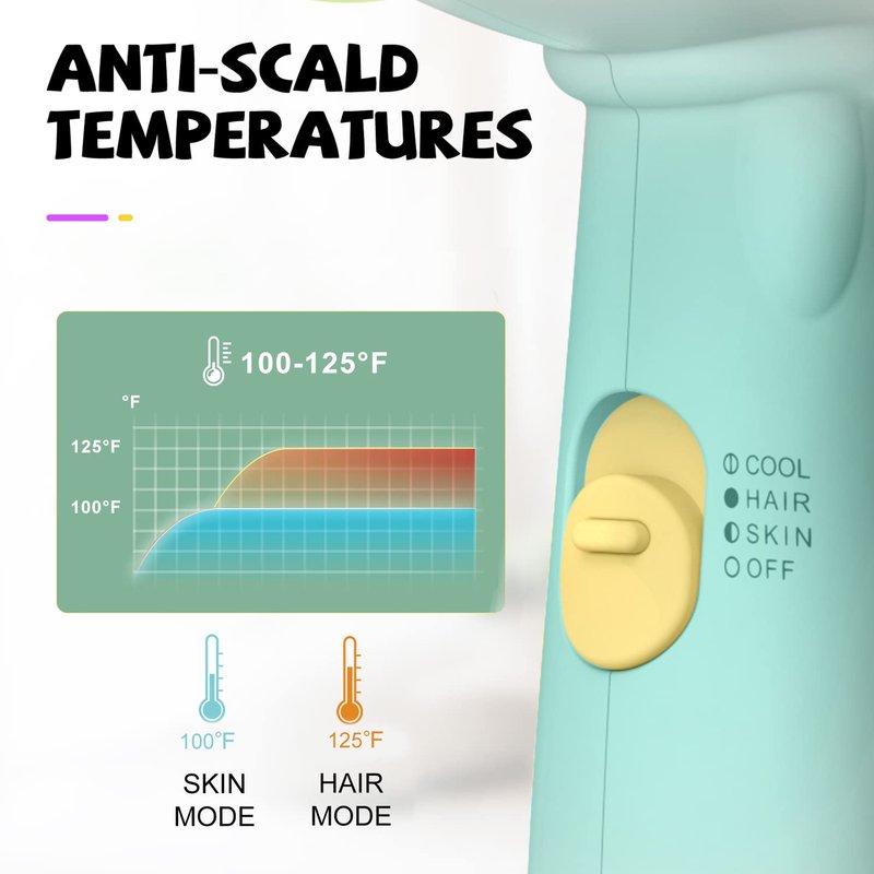 - 🎁𝐁𝐀𝐁𝐘 𝐇𝐀𝐈𝐑 𝐃𝐑𝐘𝐄𝐑-Skin mode with temperature lower than 100℉/38℃ suitable for dry out baby skin, say no to rashes. HAIR mode with temperature lower than 125℉/52℃. Anti-scald design with children grade ABS material. Cool mode is used for releasing cool air.