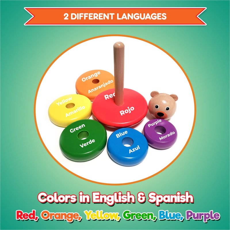- BABY TOYS & STACKING RINGS | We put a bilingual twist on the classic wood stacking toys. Little ones can bat at the stackable rings then watch what happens as it wobbles. Help enhance one's curiosity and sense of discovery with the interactive toys. Learn each color of the rainbow in English and Spanish.
