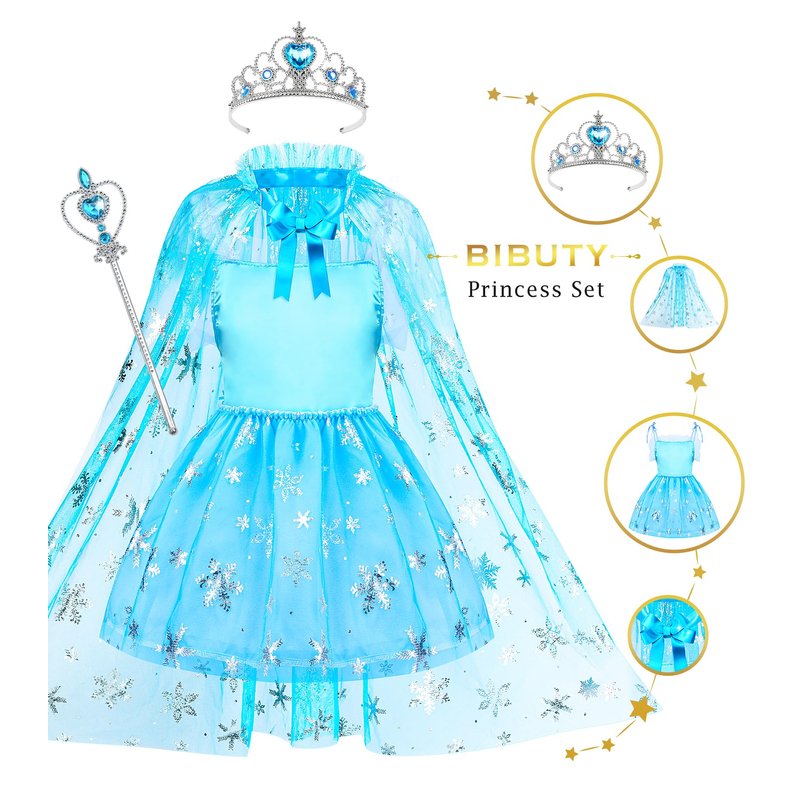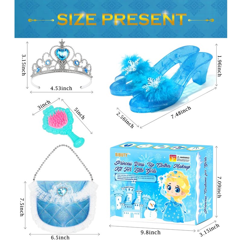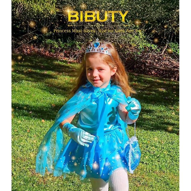 - Princess Dress Up Set for 3-6 Little Girls: Does your little girl have plenty of kids pretend play makeup set, but need all the fun princess accessories, especially the princess dress for girls. BIBUTY kids makeup kit, a hit for imaginative play time with 1 set of princess dress with cape, princess crown tiara for little girls, 1* princess dress up shoes, 1* handbag, 1 set of fake pretend makeup kit.
