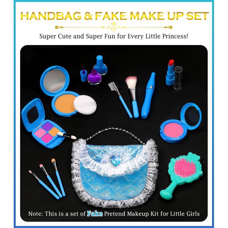- 14PCS Kids Makeup Kit for Girls of Decent Quality: Kids makeup kit for girl includes hairbrush*1, makeup brush*5, eyeshadow*1, lipstick*1, mascara*1, powder*1, blush*1, nail polish*2, powder puff*1. Beautiful and very sturdy will definitely last a toddlers rough play. Toddler princess dress up shoes are not high with tiny grip pieces on the bottom, easy for little girl to walk in.