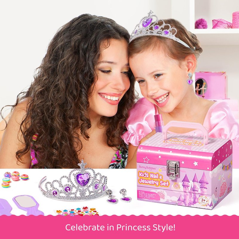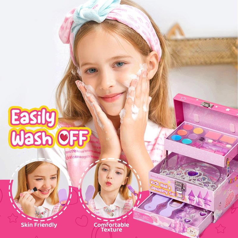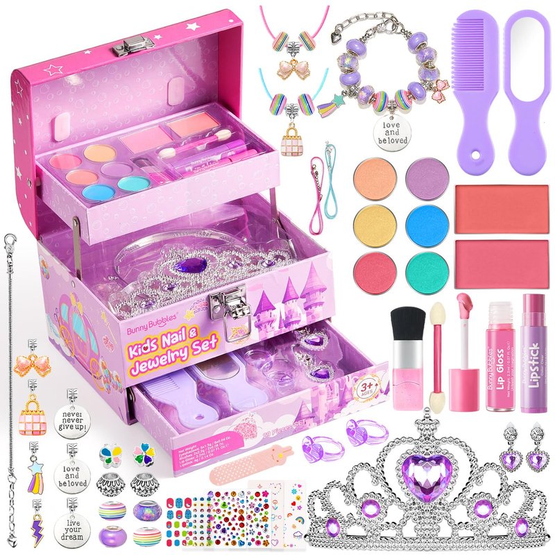 - Kids Makeup Kit Jewelry Box: This playful makeup kit includes everything a little princess needs, featuring safe & washable cosmetics, a handle mirror, and a range of fun colors. Let kids explore their creativity and style, transforming into their own version of a princess!
