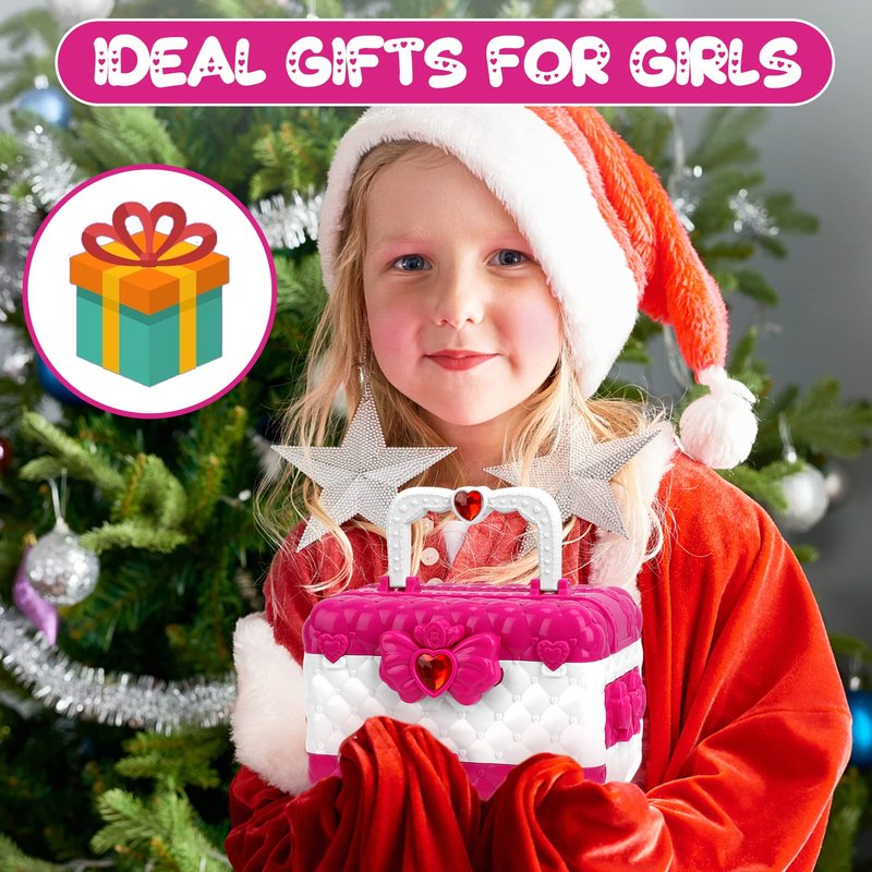 - ⭐RICH, COMPACT & PORTABLE: The size of this compact kids makeup kit for girl is designed for 3-12 year old girls. The little girls makeup case has many compartments, and when opened entirely, children can see all the tools and colors at a glance, convenient for children to use and organize. And the case has a carry handle, making it super easy for kids to travel with it. This girl toys in addition to being a multifunctional vanity case, it can also be used as a storage box for other small items.
