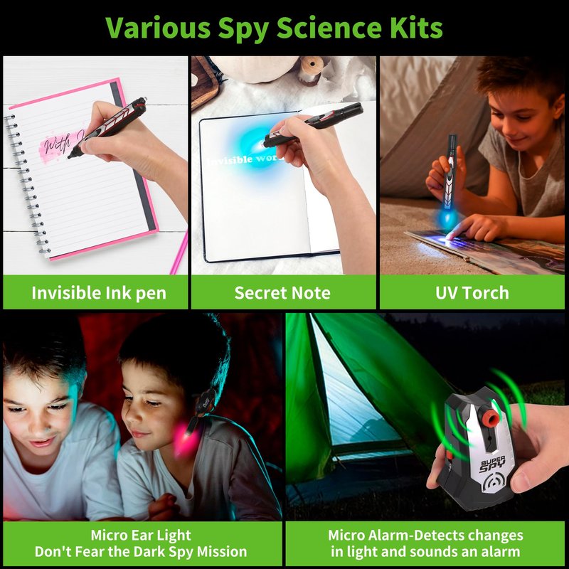 - 【5 PCS Night Vision Goggles Spy Kit & 10 Spy Missions】Total 5 pcs spy gear: night vision goggles, frisbee shooter, micro ear light, invisible ink pen, micro motion alarm. Allow kids to complete more than 10 spy missions including camping field lighting, frisbee hunting, intelligence gathering, invisible secret mission delivery, alarm sound notification and more. Get a sense of freshness and explore the world of science in spy role-play play.