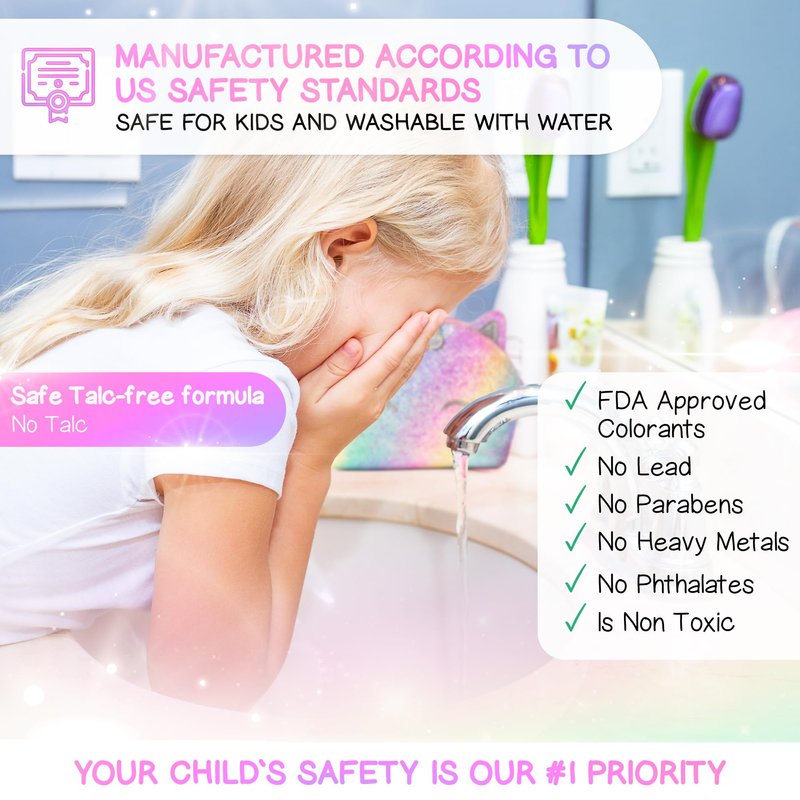 - Safe, Non-Toxic & Talc-Free: Made with high-quality, paraben-free and non-toxic materials, this kids’ makeup kit passes all US toy and cosmetics safety standards. What’s even better? Our makeup is talc-free. Parents trust this kit for its gentle ingredients and can have peace of mind while their kids spend hours playing with it.