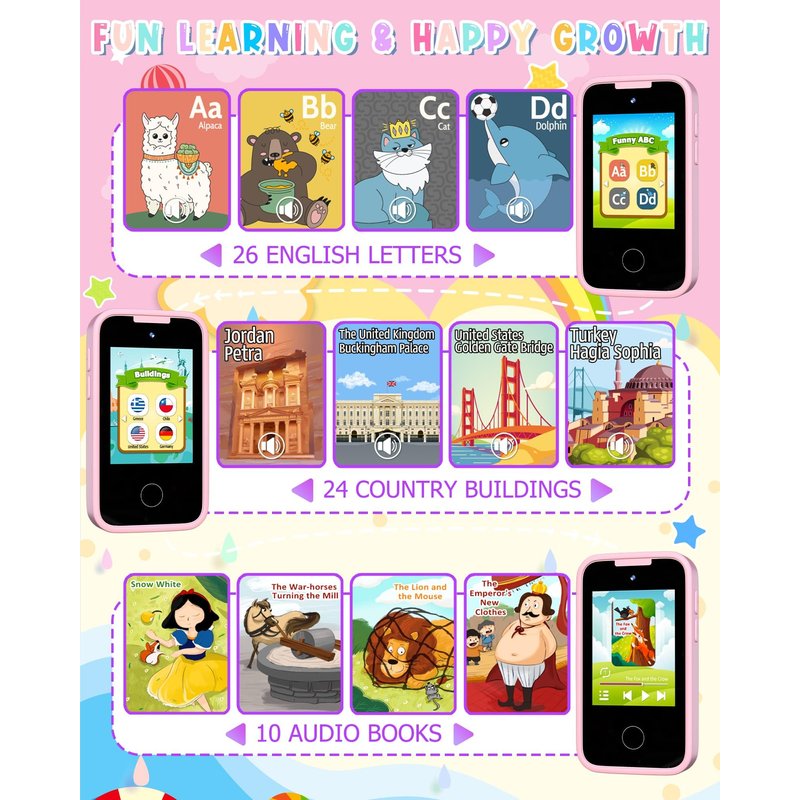 - 【IPS HD SCREEN & FULL-FREQUENCY SPEAKER】:The play phone features a 2.8” IPS HD screen that provides clear visuals and intuitive touch response, making it easy for kids to use. The upgraded full-frequency speaker delivers high-quality sound with adjustable volume. The 3.5mm jack offers private listening with earphones.