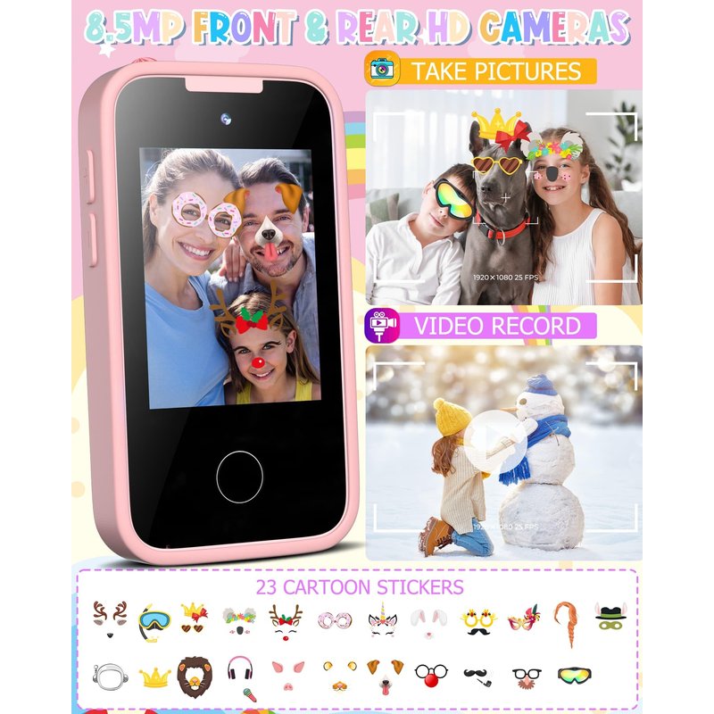 - 【FRONT AND REAR HD CAMERAS】: This toy smart phone features 8.5MP autofocus cameras on both front and back, allowing kids to capture exciting and unforgettable moments in high-quality images or videos.19 cartoon stickers add fun to taking photos, and an 8 GB memory card provides additional storage for photos and videos.